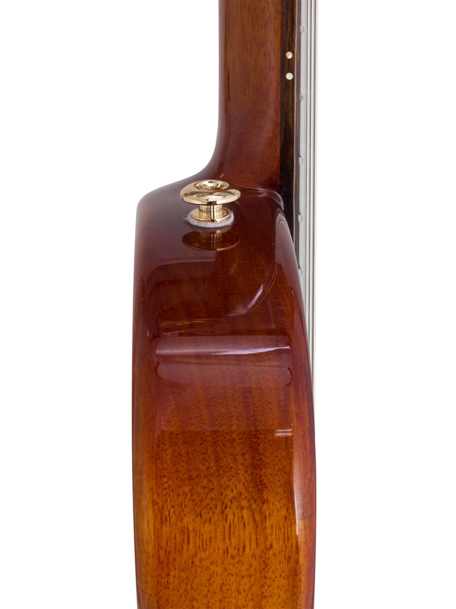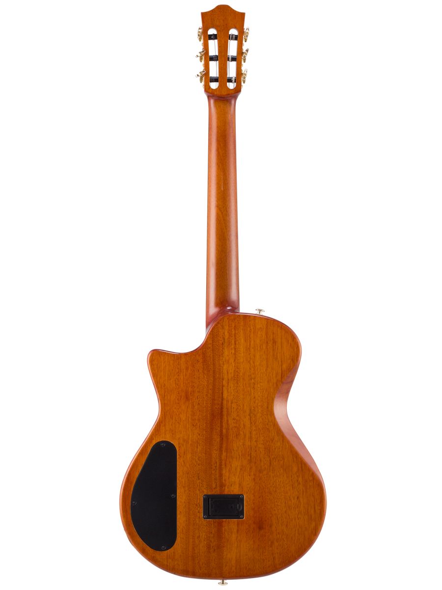 Серия: Fusion Craft Форма корпуса: Hollow Body with Cutaway Мензура: 650 мм (25 19/32”) Ширина грифа на нулевом ладу: 48 мм (1 57/64”) Ширина порожка: 45 мм (1 49/64") Корпус: махагони Верхняя дека: ель с шпоном из огненного окуме класса 5A Гриф / накладка грифа: махагони / макассарский эбен Анкерный стержень: двухсторонний Лого на голове: гора Бромо, перламутр Оформление резонаторного отверстия: «Ковбойская веревка» Бридж: "Орлиное крыло", черное дерево Amara Лады: 22 Верхний и нижний порожки: кость Колки: винтажные "Mt. Bromo", позолоченные Электроника: пьезодатчик + 3-позиционный звукосниматель под струнодержателем Отделка: глянцевый лак Цвет: Trans Black В комплекте: утепленный жесткий кейс