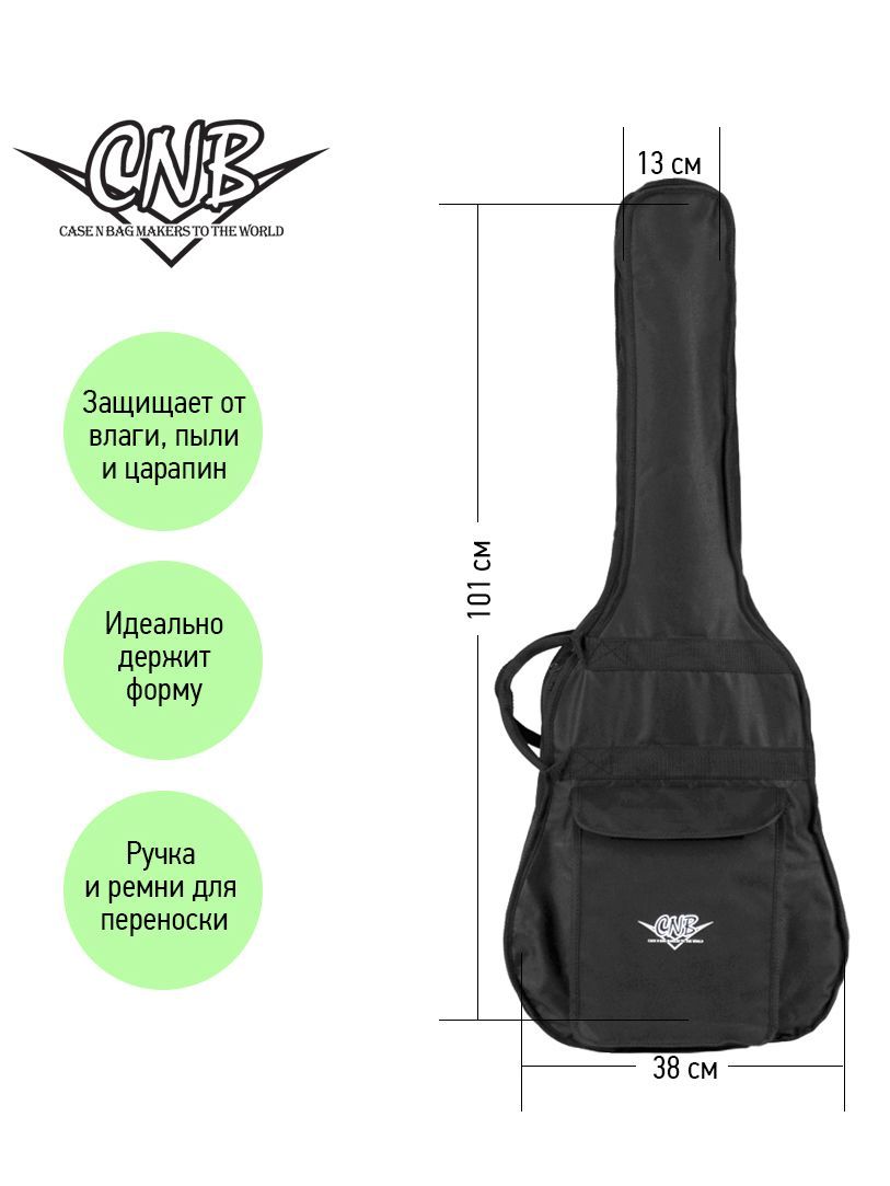 CNB CB400 – это стильный и качественный чехол для классической гитары. Главное назначение модели CNB CB400 – оберегать инструмент от внешних воздействий окружающей среды, которые негативно сказываются как на внешнем виде гитары, так и на ее звучании. Чехол изготовлен из водонепроницаемого нейлона с плотностью 600 D. Защитное уплотнение толщиной 7 мм предотвращает появление царапин и потертостей на инструменте. Чехол закрывается на прочную молнию с крепкими зипперами. Модель имеет большой наружный карман для хранения нот и гитарных аксессуаров. Заплечный ремень позволяет с удобством переносить гитару за спиной. Для транспортировки инструмента в горизонтальном положении имеются две прочные боковые ручки. Модель CNB CB400 выполнена в черном цвете, однако классический дизайн прекрасно дополняет логотип компании, расположенный на кармане.   Чехол CNB CB400 создан не только для надежной защиты инструмента, но и для вашего комфорта.