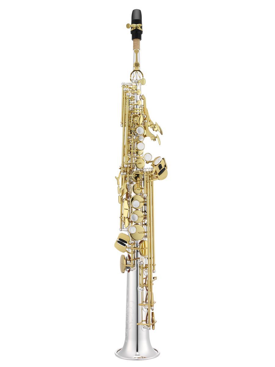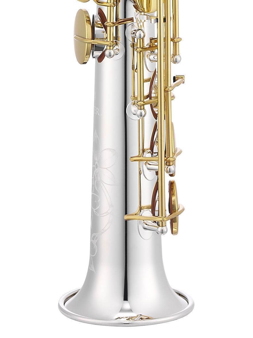 Jupiter JSS1100SGQ Саксофон сопрано Bb, прямая и изогнутая эска "Sona-Pure", клапан верхнего F#, клапан верхнего G, регулируемый упор для большого пальца, материал - латунь, посеребренный, покрытие клапанов золотой лак, облегченный кейс JKC-SS39FQ