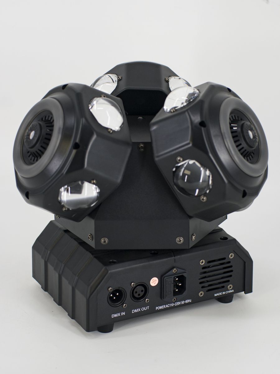 Led Star MA-E031 Вращающаяся светодиодная тройная голова, 200Вт, Beam 12*10Вт RGBW (3x4), Halo 3 кольца 12*0.2Вт RGB, Laser зеленый, красный, синий, авто, звуковая активация, DMX512, ведущий/ведомый, линейный диммер