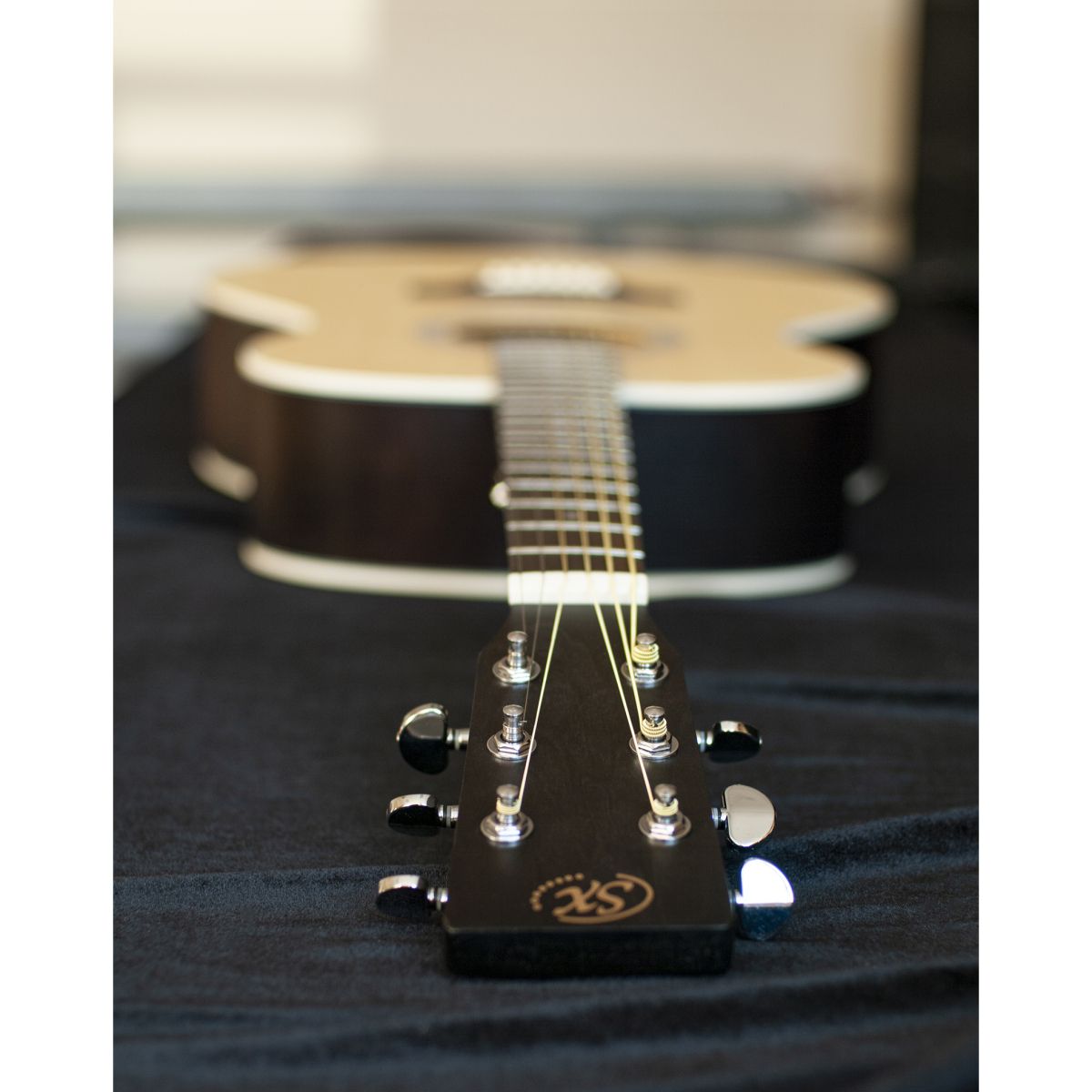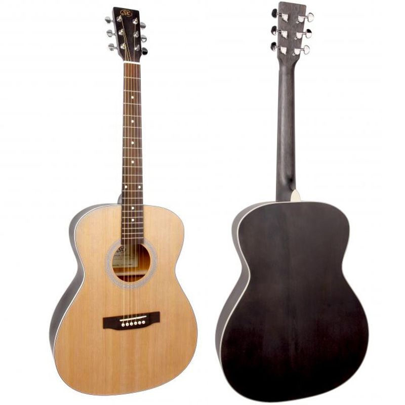 SX SO204TBK Гитара акустическая, верхняя дека ель, нижняя дека и обечайка: агатис, гриф: окуме, накладка грифа и нижний порожек: палисандр, колки: хромированное покрытие, цвет TBK
