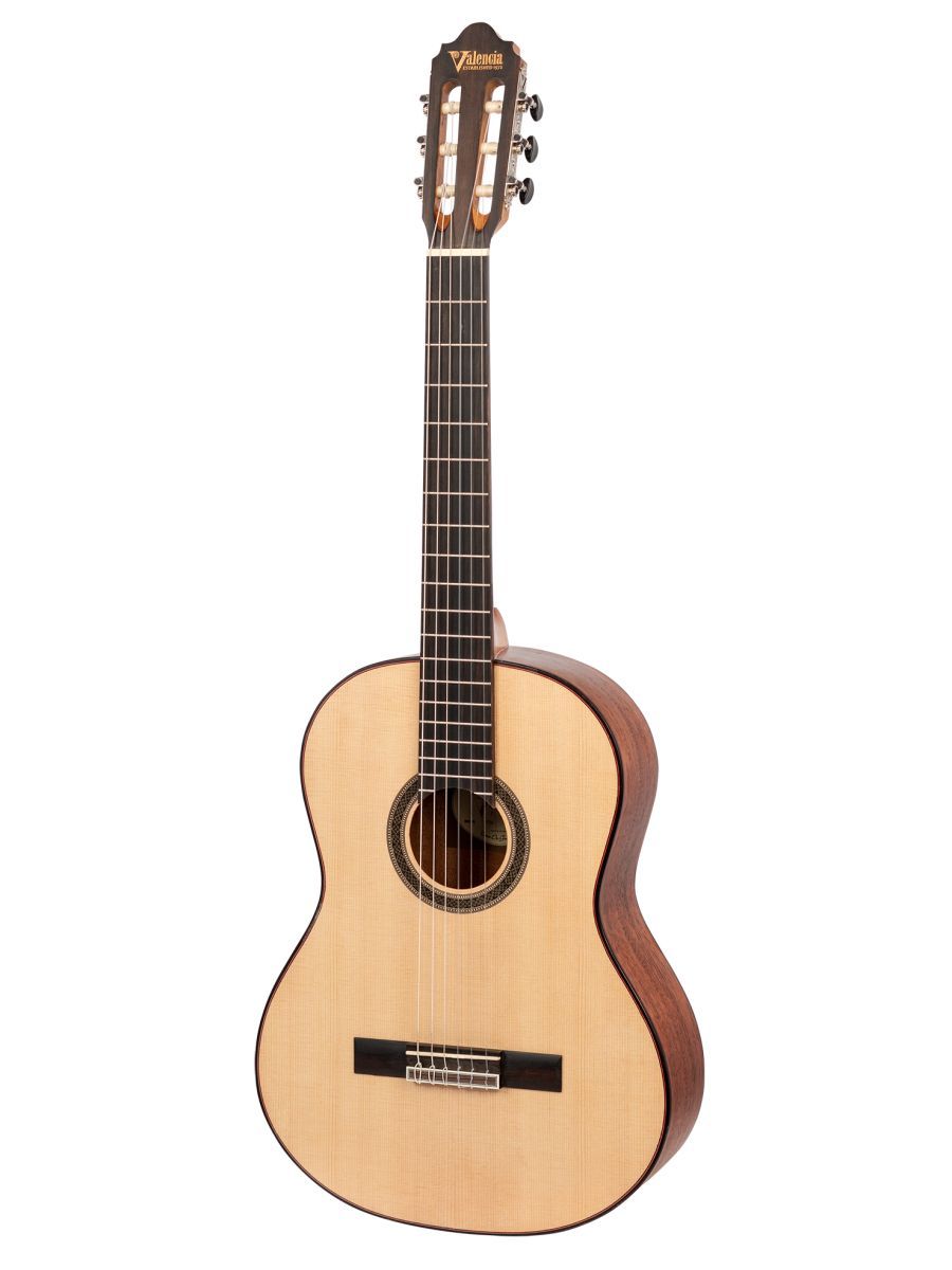 Valencia VC704 Гитара классическая, верхняя дека: цельная ель, нижняя дека и обечайка: махагони, гриф: махагони, накладка грифа и нижний порожек: черное дерево Амара, цвет Natural